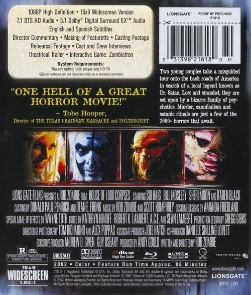 Delve into a world of spine-chilling horror with "House of 1000 Corpses" on Blu-ray, a thrilling addition to any horror aficionado's collection. This gripping movie features a stellar cast including Sid Haig, Bill Moseley, Karen Black, Chris Hardwick, and Sheri Moon Zombie, ensuring a performance that will haunt you long after the credits roll.