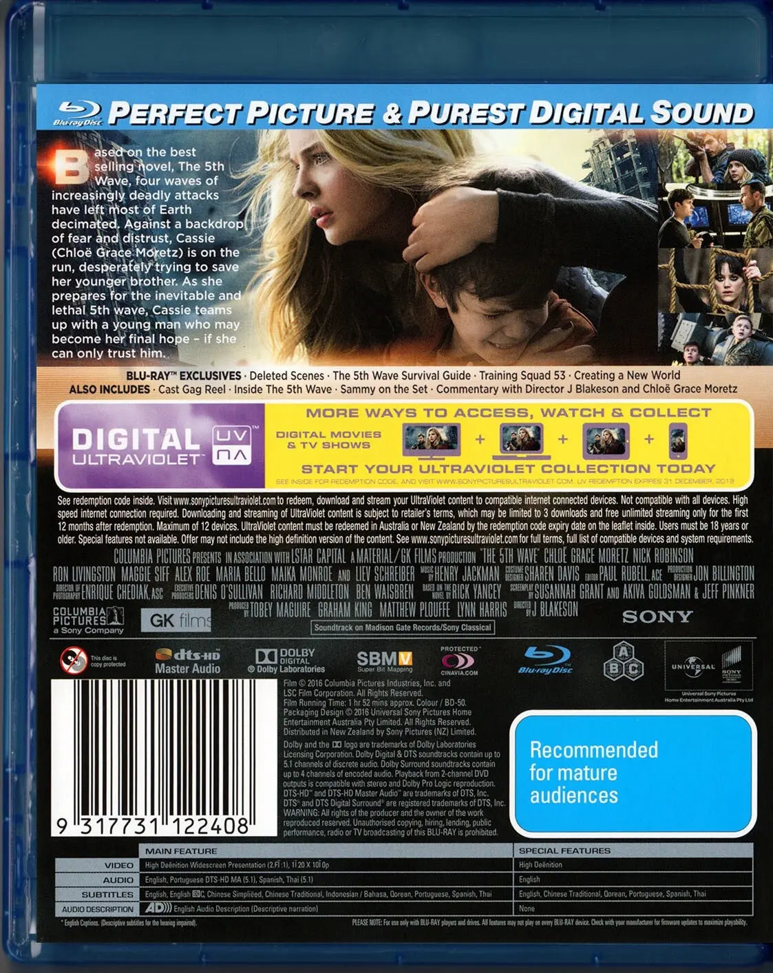 Get ready for an epic adventure with "The 5th Wave" on Blu-Ray. This action-packed sci-fi and fantasy movie, directed by J Blakeson, features an all-star cast including Nick Robinson, Chloë Grace Moretz, and Ron Livingston.